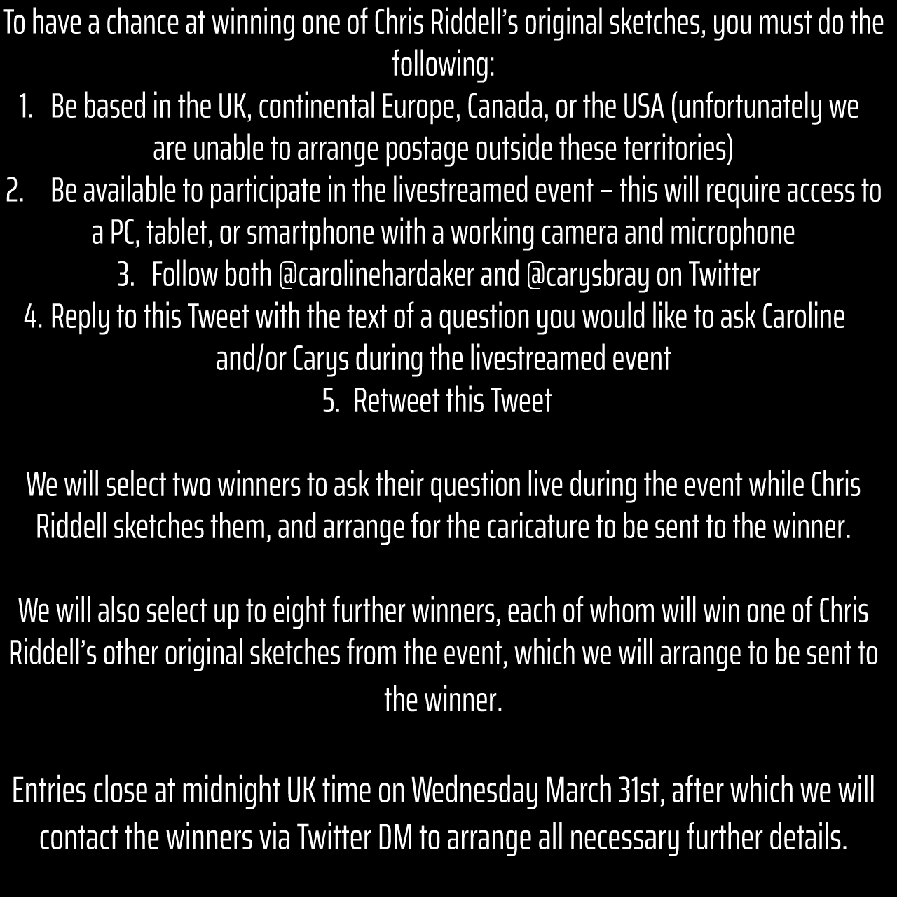 By submitting questions before the event (see below for instructions for how to enter via Twitter) to win an original Chris Riddell drawing!