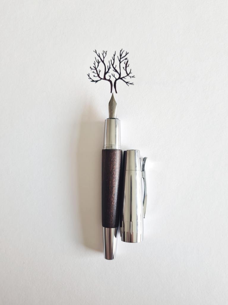 For this pen, I chose something that brought together the past and future, and this Faber Castell e-motion Fountain Pen in Pearwood is crafted from the shiniest chrome and wood. The grain is stunning, and it’s aged so well. I’m sure it’s getting darker and more luscious.