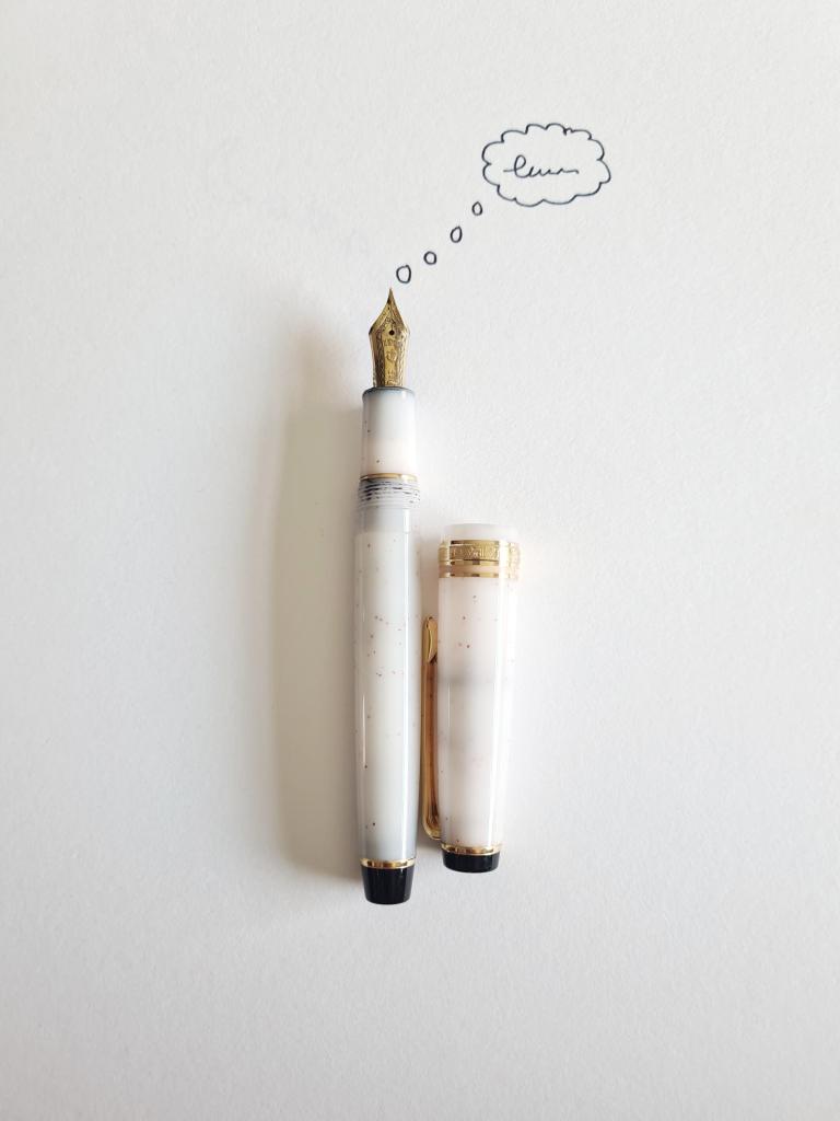 The book begins and ends with snow. And quiet. And loneliness. And this pen seemed to embody this. The gold means opulence but the white speckled with blood-red was peaceful and yet sinister enough for me to make the connection. It just felt so goddamn right.