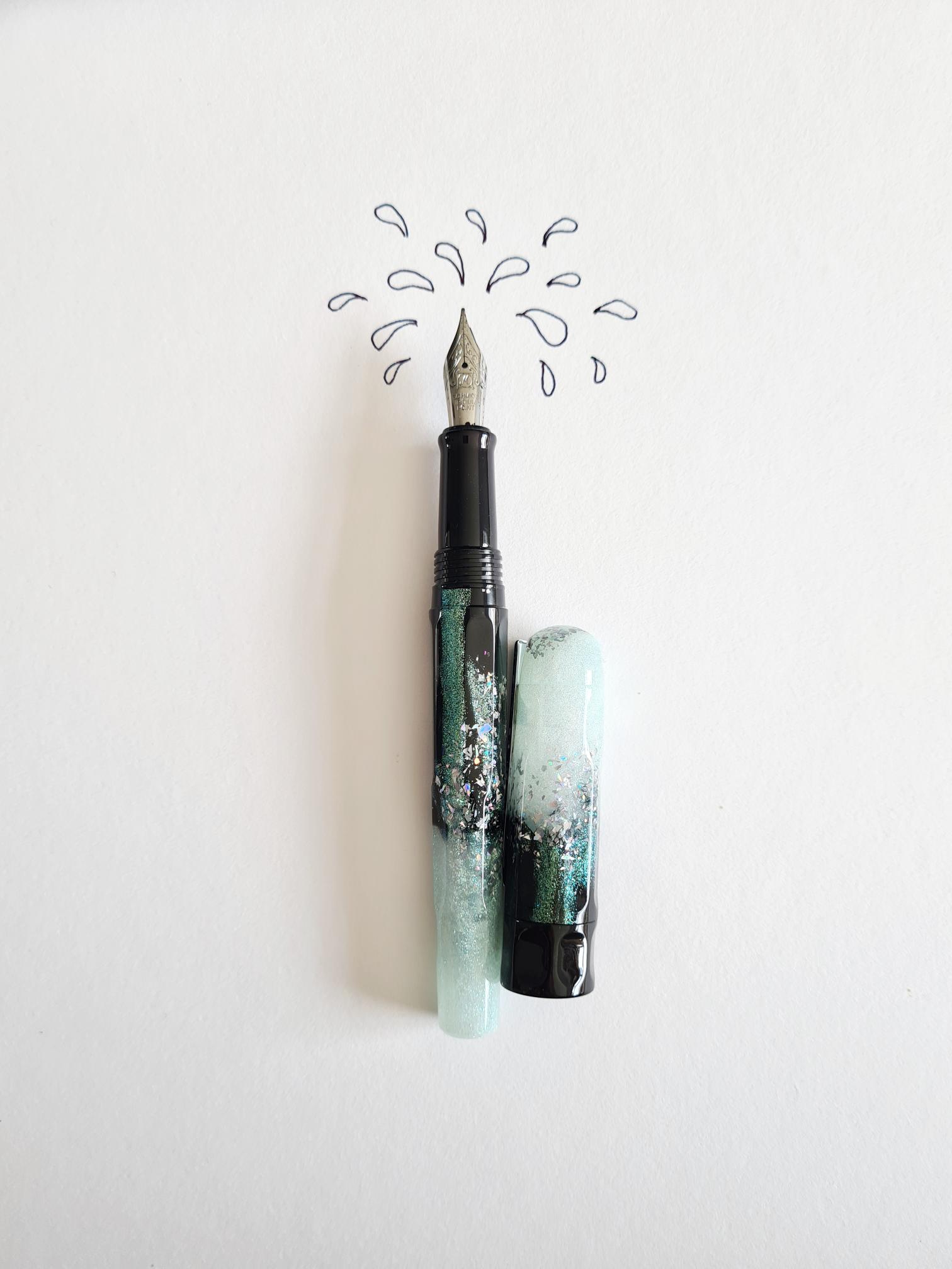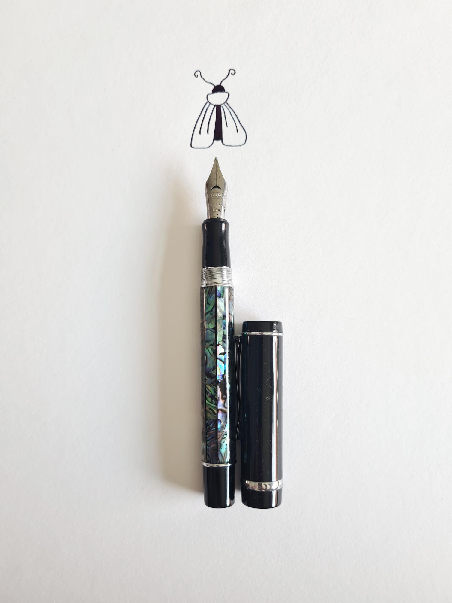 There was only one pen that could match it. This Conklin Duragraph Fountain Pen in Abalone Nights is made from mother-of-pearl and abalone shells. Depending on which way you turn it, you’ll see many shades of blue, turquoise, green and yellow. For me, it’s all the shades of moths and winged things that creep about in the dark.