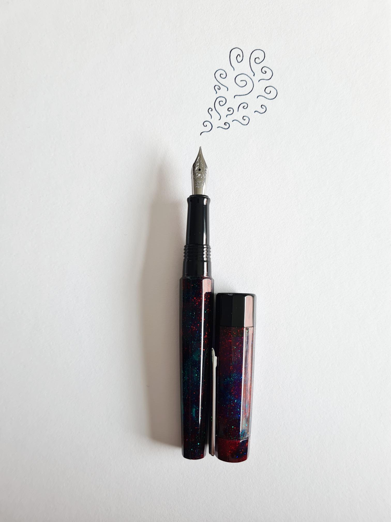 BUT, when I first saw this pen, I saw the story’s landscape reflected there in the bloody sky. The whole story takes place between dusk and dawn, and there are a lot of dark and mythic things that happen in-between. This brooding, mysterious, and frankly witchy pen fit the bill.
